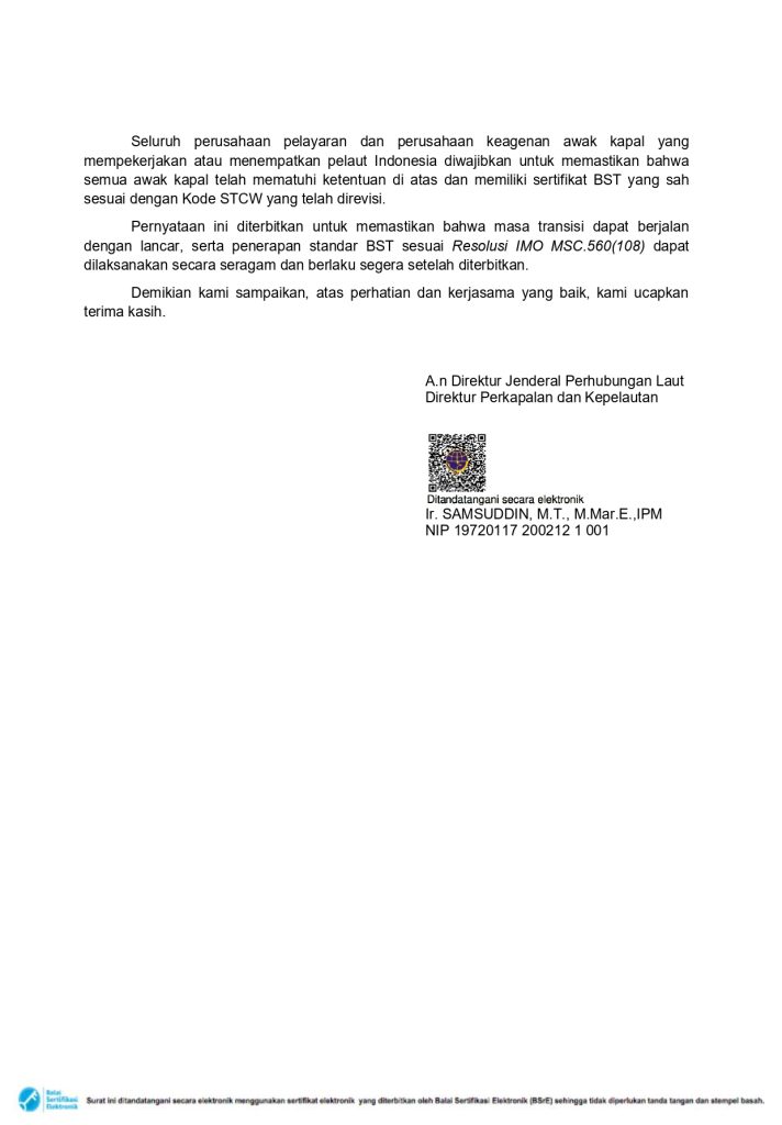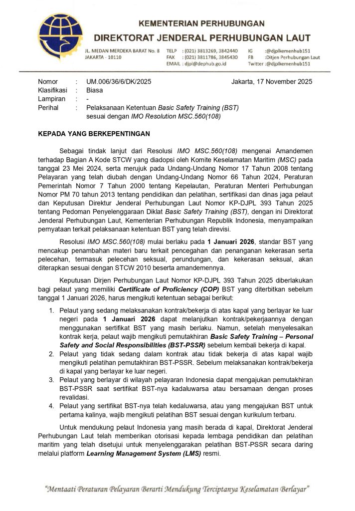 Pelaksanaan Ketentuan Basic Safety Training (BST) sesuai dengan IMO Resolution MSC.560(108) telah dikeluarkan. Ketentuannya adalah sebagai berikut :